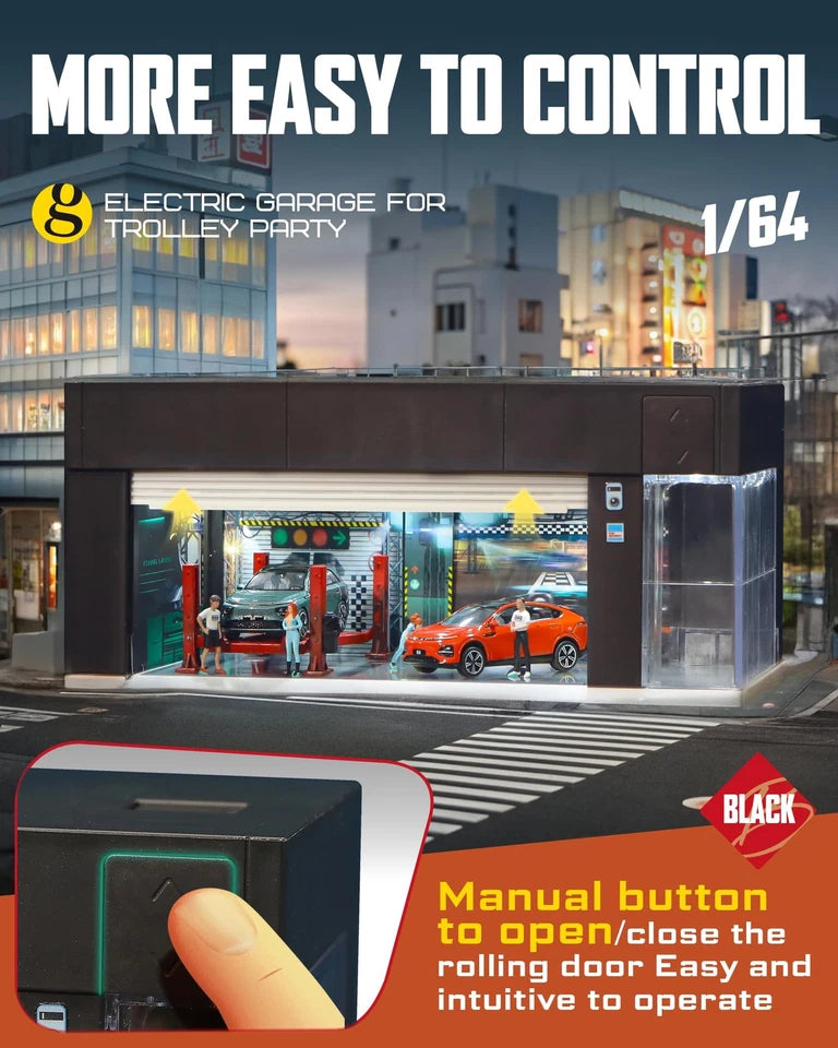 1/64 Model Car Display Garage - This 1:64 electric garage display case is perfect for storing and displaying 1:64 scale car models. It's got all the details and is made with top-notch materials to make it look realistic. They've got these built-in LED lights that come on as soon as you open the car door, which makes the scene look really cool.