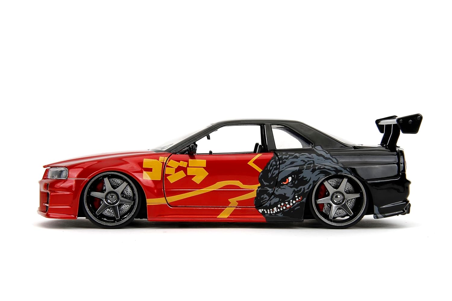 The Nissan Skyline GTR R34, known in car culture as "Godzilla", is now in 1:24 scale Die-Cast. The vehicle deco is inspired by Godzilla and built with speed and terror, like the giant beast himself. This 1:24 scale vehicle is made of die-cast metal and has opening doors, hood, and trunk. With premium sculpt and paint finishes, this vehicle is equipped with a highly detailed engine, interior and exterior and premium rubber tires. Add to your Hollywood Rides collection.