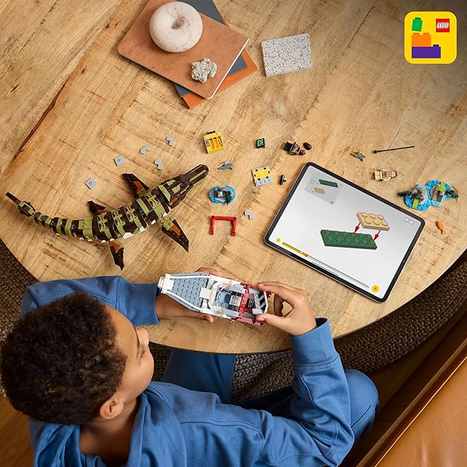 Imagination toys – This LEGO Jurassic World toy dinosaur set includes 2 small reef builds for the Mosasaurus and boat to rest on, a syringe case, 5 sample syringes and more