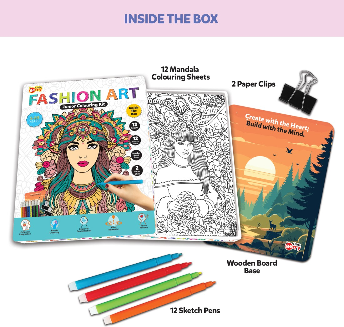 Escape the everyday with the Fashion Art Colouring Kit! This all-ages set features 12 unique mandala designs, from simple to intricate, on high-quality, bleed-proof paper. Colouring mandalas is a proven method for reducing stress, improving focus, and promoting mindfulness. This kit is a perfect activity for adults and children alike, fostering artistic expression and relaxation. It also makes a thoughtful and affordable gift for any occasion!