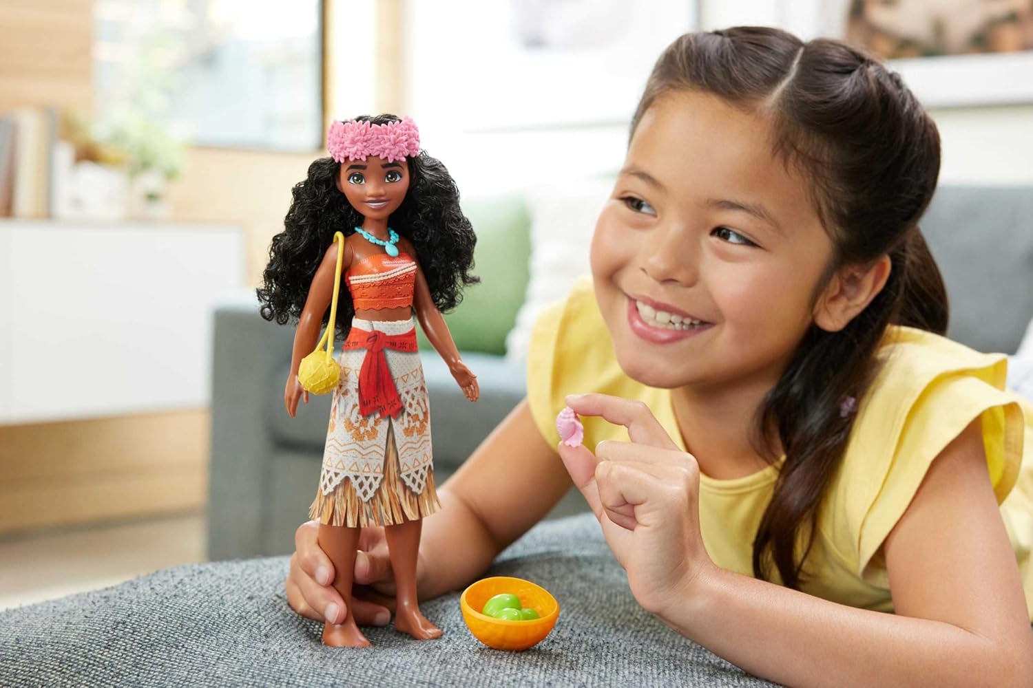 Epic ocean quests await with Island Adventure Moana doll, inspired by Disney's Moana. This fashion doll is ready to discover all that the island has to offer in her signature two-piece outfit. Help Moana doll collect treasures like a seashell and fruits or style her flower crown and necklace. Fans can re-create their favorite movie moments or embark on their own storytelling excursions! Doll cannot stand alone. Colors and decorations may vary.