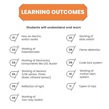 2) Offering10 Activities and learning outcomes - Electric Switch circuit | Potentiometer with LED | Invisible light | Flame detector alarm | Two way Switch | Electronic code lock switch for doors | Intruder alert system | Emergency light with power failure alarm | Bicycle turning lights | Parking slot alert system.