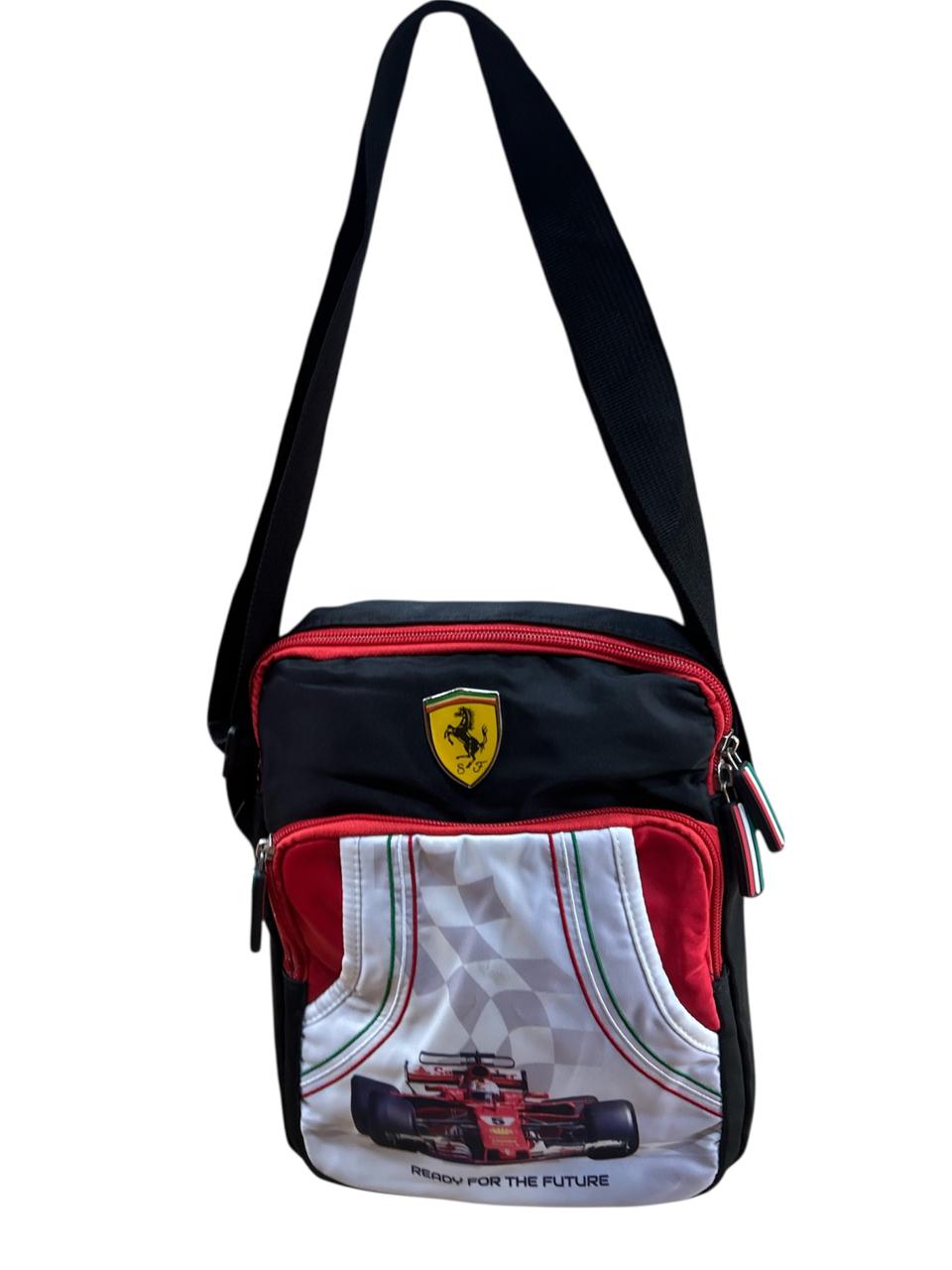 The neat design is made from durable material with a zip closure to secure contents and an adjustable strap for easy carrying. The bag features a handsome colour pairing and Ferrari applique to be a hit among young fans.