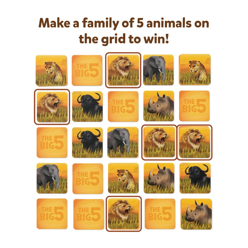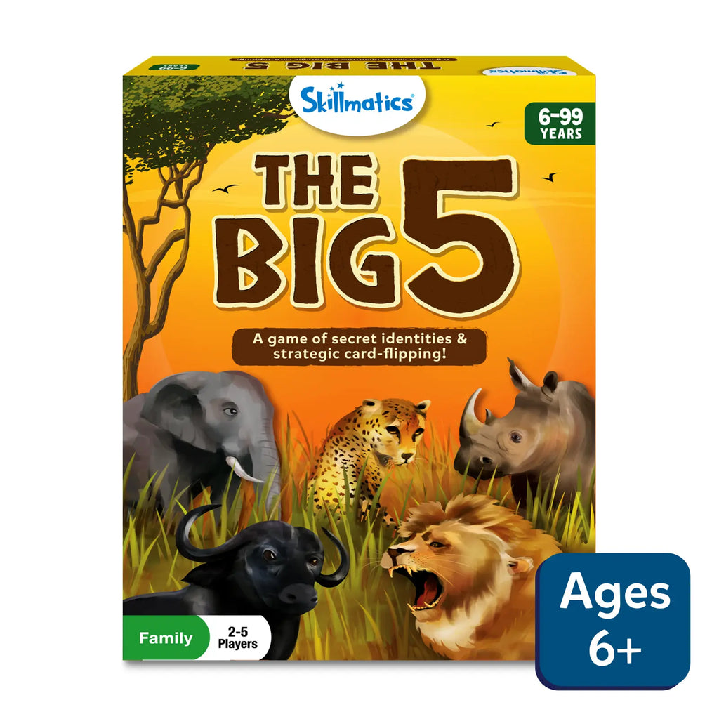 THE BIG 5 is for those who love secret identities and fooling others! Strategize as you flip cards and swap identities to be the first player with a family of 5 animals! Get ready to compete to reign the savannas!
