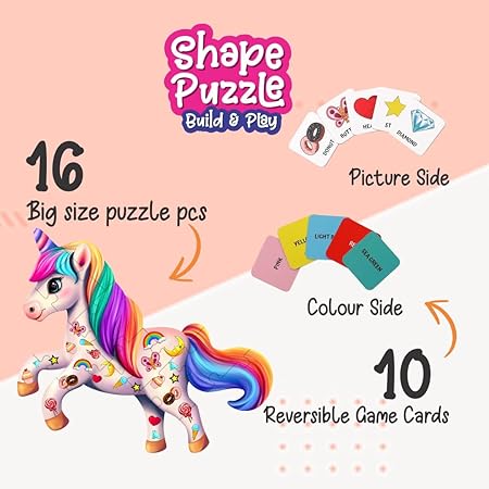 1) Shape Puzzle: The Unikplay Shape Puzzle Game features 16 big pieces that come together to form a vibrant and colorful shape, sparking creativity and fun for kids aged 3-7.