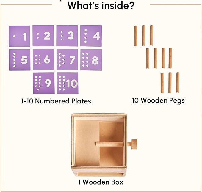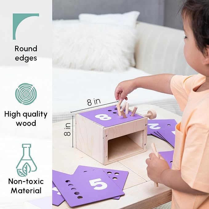 1) MONTESSORI EDUCATIONAL TOY: Place numbered plates on the wooden box, each plate's holes correspond to its number. Inserting pegs in holes provide an easy way for children to learn about numbers, counting, addition & subtraction while building essential math skills
